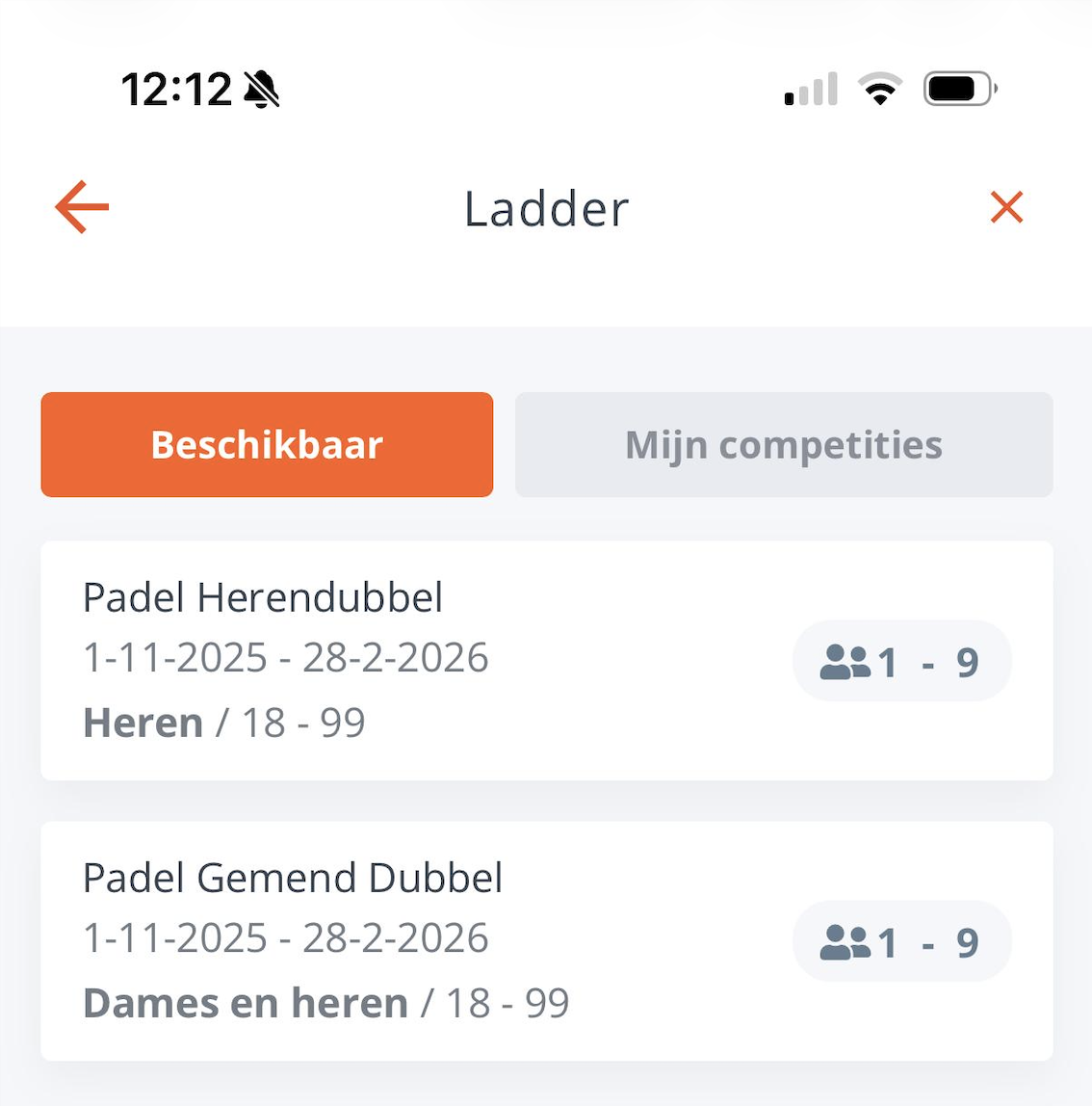 Zodra je een categorie hebt gekozen, vormen jullie een koppel en schrijf je je in via de ClubApp: Spelen → Wedstrijden → Ladder.